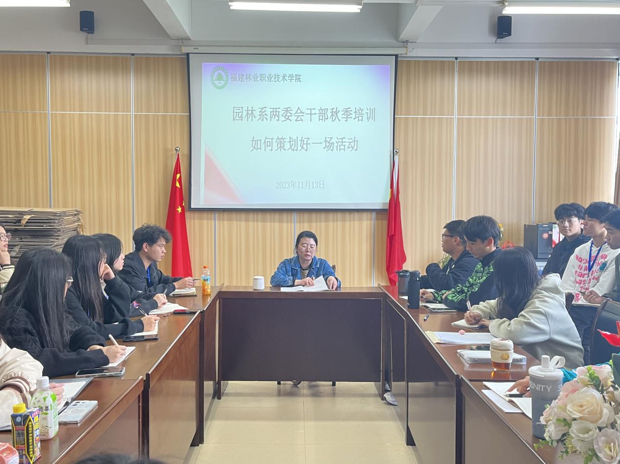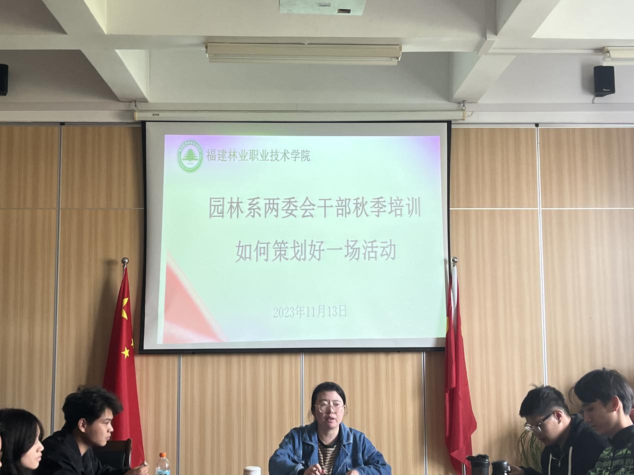 为提高园林系两委会干部策划能力和组织能力,提高园林系学生活动的质量。于2023年10月29日,吴锦鸿老师给两委会干部开展关于如何策划好一场活动的培训。