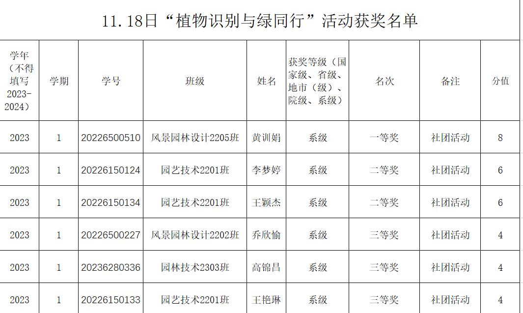 此次大赛将理论学习与实践探索密切结合,起到了“以赛促教、以赛促学”的教学效果,加强了同学们对校园植物的识别能力,也养成了善于观察、勤于探索的好习惯,为学习后续专业课程打下坚实的基础。同时借此机会亲近大自然,初步感受了春天的气息。植物是自然界的重要组成部分,也是人与自然和谐共处的关键,植物识别在植物资源的开发与生态环境的保护等领域发挥着重要作用。