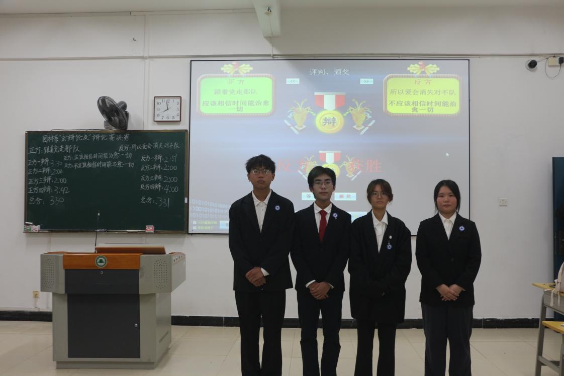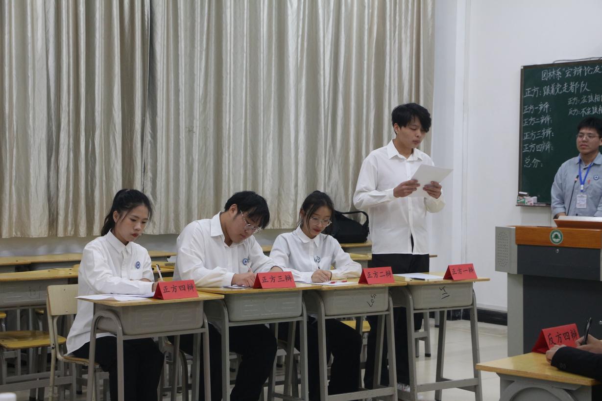 “一时强弱在于力,万古胜负在于理。”为了培养同学们团结协作的能力以及提高大家的逻辑思考与表达能力。2023年11月24日下午,园林系在教学楼405举行了“宏辩论友”辩论赛决赛。本次出席的有陈玮老师、刘延君老师,院学习部部长叶成宇、部副部长黄佳琳,园林系主席团黄咏奕、林路明、傅田田。