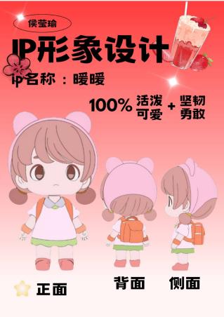 作品说明:该IP形象名为暖暖,以学生为设计灵感,小熊头巾、背包为设计元素,更加契合我校青年大学生热爱志愿活动、热心为服务他人的主旨,以暖色为主色调,渲染志愿者的人文情怀,IP形象暖暖的性格是活泼可爱、坚韧勇敢的,爱好运动,喜欢调整自己,最重要的特点是永远对生活保持热爱。