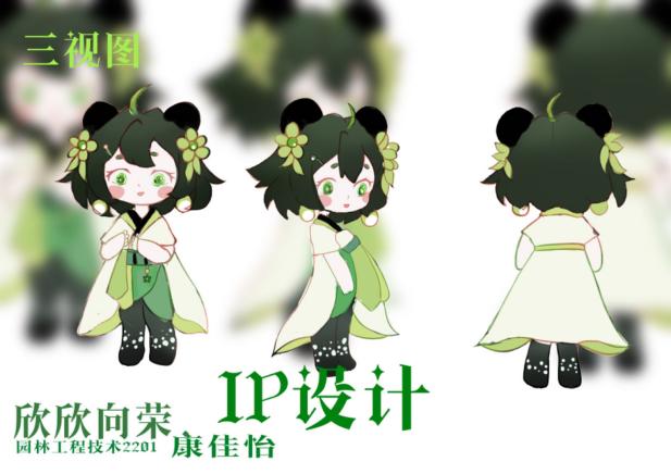 作品说明:设计的IP名为“欣欣”,谐音“心心”更能凸显志愿服务队无私奉献的爱心,作品以国宝熊猫为灵感进行设计,熊猫可可爱爱的形象外表,让同学们看到这个IP形象,就能够联想到我们志愿服务队的可爱志愿者们。配色上采用黑,白,绿配色,相互协调,更加凸显出我们园林系主题色系,头饰从小红花志愿服务队的名称中提取花朵元素进行设计,使整个IP的形象更加生动活泼可爱,绿色象征着生大自然与强大的生命力,更能够表现出园林系小红花志愿服务队生生不息的志愿服务精神。