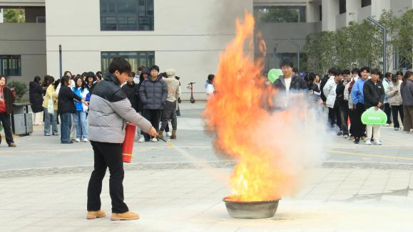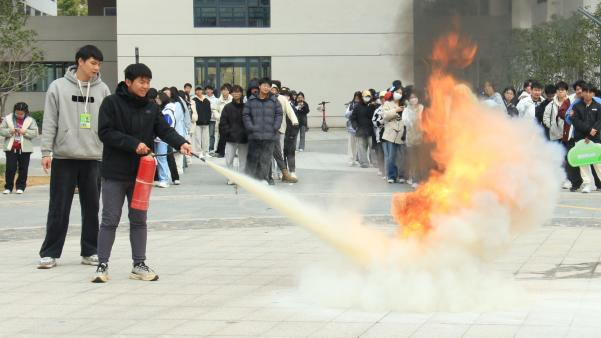 随着一阵急促的疏散哨声响起,模拟火场逃生环节正式拉开序幕。同学们迅速响应,严格按照指导要求,弯腰低姿、捂住口鼻,沿着预先规划好的疏散路线,井然有序地撤离至园林楼前的安全区域。抵达园林楼后,学院安全保卫处宣讲团成员缪永吉通过细致入微地讲解和标准规范的分解动作示范,让同学们对灭火器的操作步骤有了清晰直观地认识。为了加深同学们的理解和记忆,还特别邀请了部分学生亲自上手操作,亲身体验灭火过程。同学们踊跃参与,在实践中进一步巩固了所学的消防知识,真正将消防安全的“种子”深植于心间。