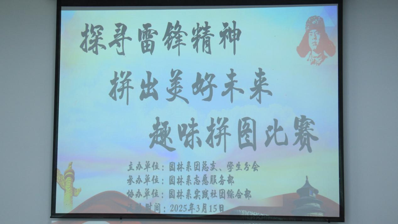 为弘扬雷锋精神,园林系于2025年3月15日成功举办了“探寻雷锋精神,拼出美好未来”拼图比赛。本次活动由园林系团总支、学生分会主办,园林系志愿服务部承办,园林系实践社团综合部协办,吸引了众多园林系学子踊跃参与。