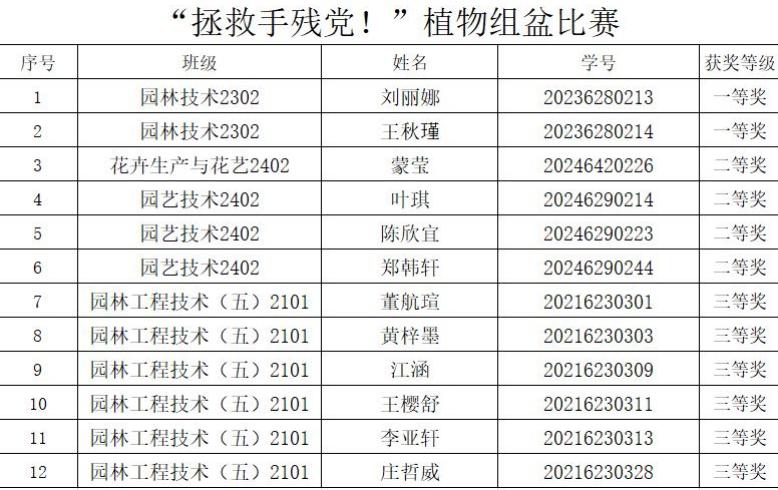 此次植物组盆比赛,既是对园林系专业学生实践技能的全面检验,也是系部教学成果的生动展示。未来,园林系将持续创新实践教学形式,开展更多兼具专业性与趣味性的实践活动,为培育高素质园林园艺园林类技术技能人才夯实基础,推动校园文化发展。