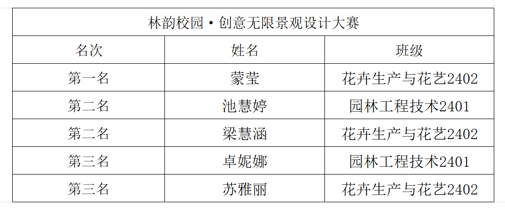 此次大赛的成功举办,为校园文化建设开启全新篇章。园林系将以此为契机,持续推进专业特色与校园环境的深度融合,通过举办系列主题创意赛事,系统性挖掘林业文化内涵。未来,园林系将着力构建集教学实践、科研创新、文化传承、艺术审美于一体的生态智慧校园,致力于为师生打造更具专业特色、人文温度与创新活力的学习生活空间。