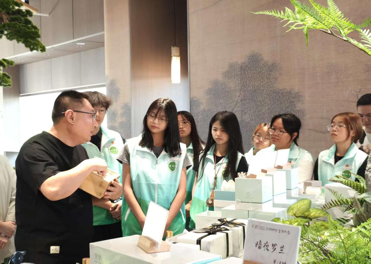 建瓯市大学生创新创业服务站负责人徐景辉向队员们讲解了建瓯的北苑贡茶文化,建瓯市打造全茶产业链,以第二产业工艺加工以及第三产业茶品牌建设、产品创新为重点抓手的茶产业布局。并介绍了馆内特色文创、茶周边产品中的巧思与创意,鼓励大学生们激发创新思维,发挥专业才能为产业振兴注入青春活力。