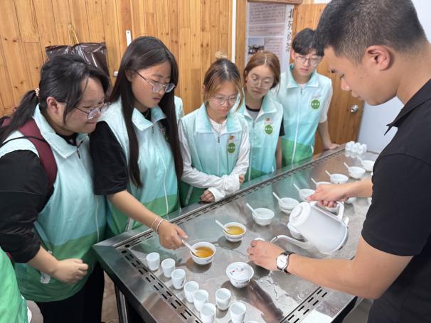 下山后踏入茶香四溢的制茶车间,在负责人的专业介绍下队员们近距离感受到传统制茶工艺,萎凋、凉青、做青、杀青、揉捻……每一个步骤都宛如一部生动的史书,承载着茶产业代代相传的深厚底蕴,更蕴含着与自然和谐共生的生态智慧。队员们沉浸在茶香氤氲的氛围中,对传统制茶工艺有了更为深刻的体会。