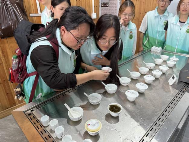 随后队员们走进建瓯市霁语农业发展有限公司评茶室,深入感受“手工制茶”与“机器制茶”之间的区别。经过品尝和对比,队员们发现“手工制茶”遵循传统的制茶工艺,虽然制作过程耗时较长、产量较低,但茶叶能够充分保留其天然的香气,口感醇厚、品质高。而机器制茶虽然具有生产效率高、产量大的优势,但在茶叶的品质和口感上存在一定的差距。通过体验大家深刻认识到茶产业中所蕴含的“精益求精”的匠心精神,并结合自身学习、工作展开深入思考与讨论。