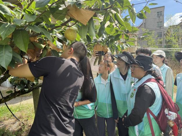 下午,实践队员转场至玉山镇翠冠梨种植基地。走进梨园内,颗颗饱满圆润的果实在翠绿枝叶间忽隐忽现。基地负责人为队员们详细讲解翠冠梨套袋防护的养护要点与精细化管理流程。通过实地观察和互动交流,队员们认识到科学种植和管理在果树栽培中的关键作用,为助力乡村经济与产业发展积累宝贵的实践经验。
