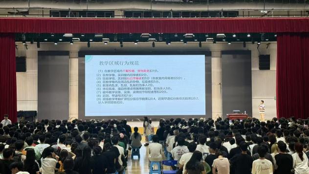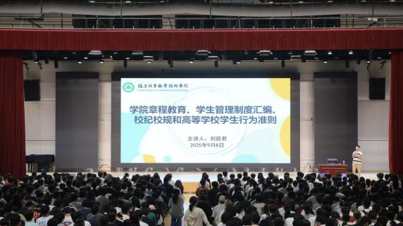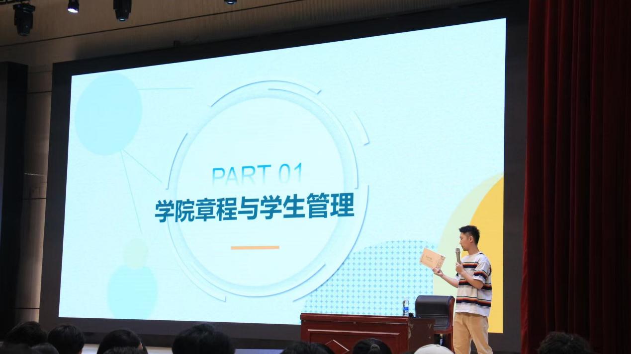 随后,刘延君老师围绕《学生手册》核心内容展开系统讲解。他从规章制度的总体框架入手,详细解读了行为管理规范、学籍管理细则、纪律处分条例及宿舍管理规定等关键内容,引导新生全面了解学校管理要求。同时,强调新生应自觉遵守校纪校规,积极参与校园文化活动和社会实践,在德智体美劳各方面实现全面发展,为大学生活确立清晰目标。