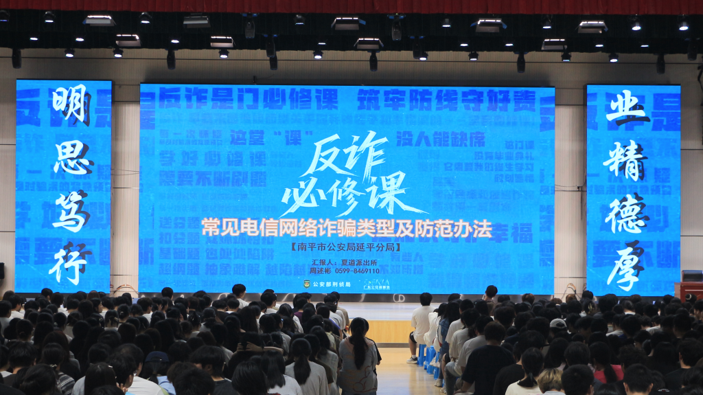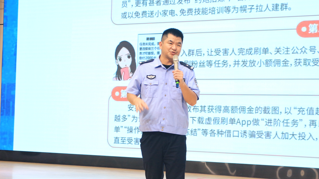 讲座中,蔡建飞警官以互动提问“大家是否认为自己会遭遇诈骗”开篇,迅速拉近与学生距离,引发深度思考。他结合多起真实典型案例,系统拆解电信网络诈骗的常见手段与作案特征:针对刷单类诈骗,明确其“高薪诱惑、任务简单、平台虚假”的共性陷阱,警示学生切勿因贪小利而失大义;同时,详细讲解虚假购物、游戏账号交易、涉黄引流、冒充客服退改签、冒充领导熟人等诈骗类型的甄别要点。此外,蔡警官着重强调“拒当电诈工具人”的法律责任与道德义务,呼吁学生增强风险防范意识,并现场建议师生安装国家反诈中心 APP,借助技术手段筑牢安全防线。