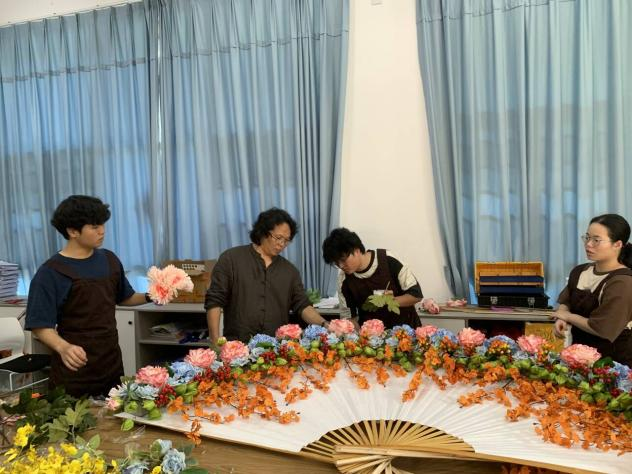 本次活动以两把直径为2米的折扇为花艺装饰载体,围绕“扇面造型”插花展开实践教学。在准备阶段,陈荣顺老师从花材的基础处理入手,现场演示修剪技巧。他一边修整枝叶,一边讲解关键细节:花朵分枝的角度控制、花叶修剪的精准长度,以及跳舞兰动态美感的呈现方式。每个步骤都紧扣“扇面造型”的艺术追求,为同学们的后续实操打下坚实基础。