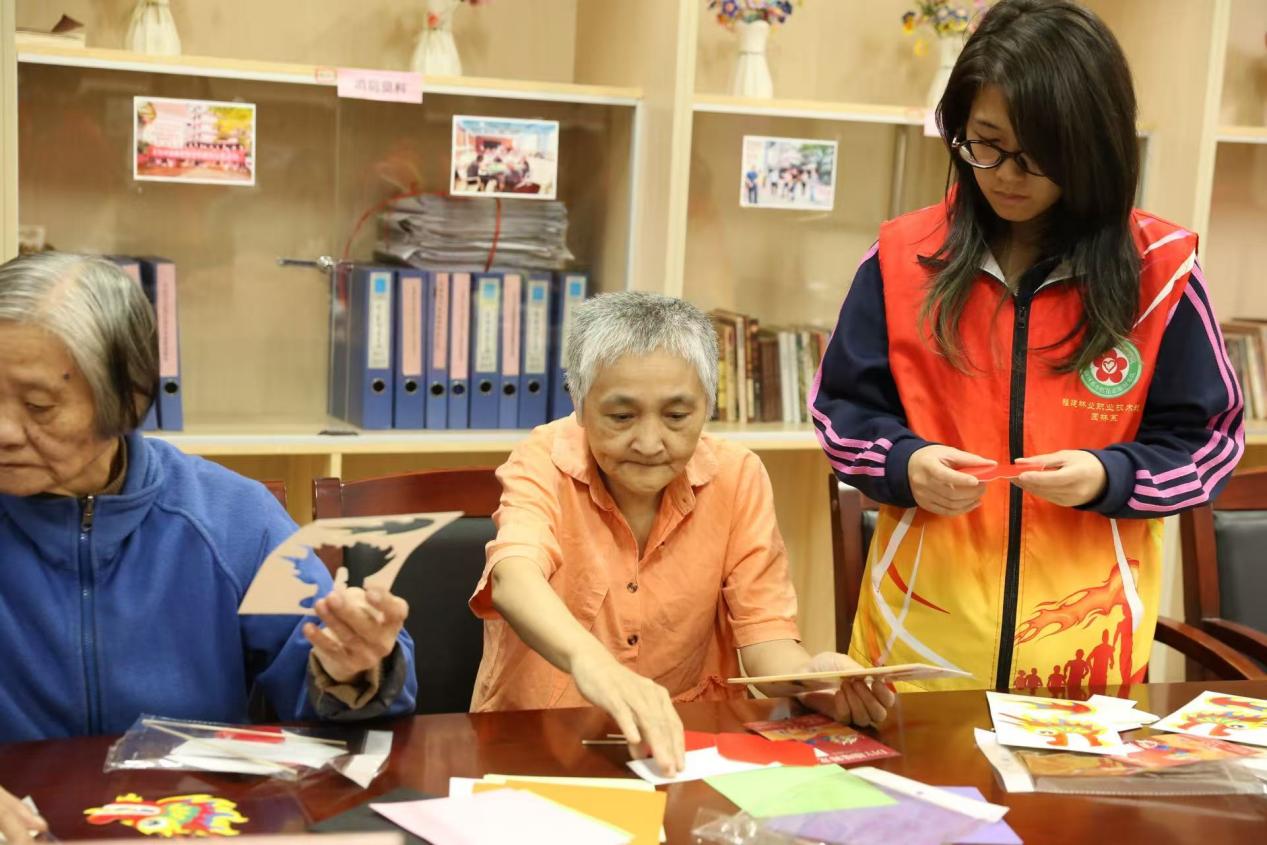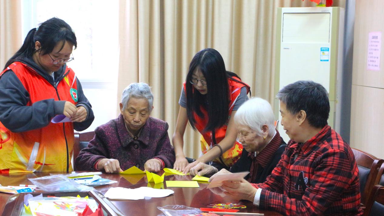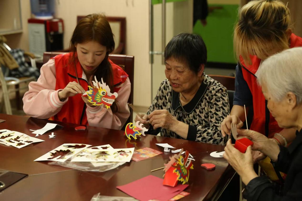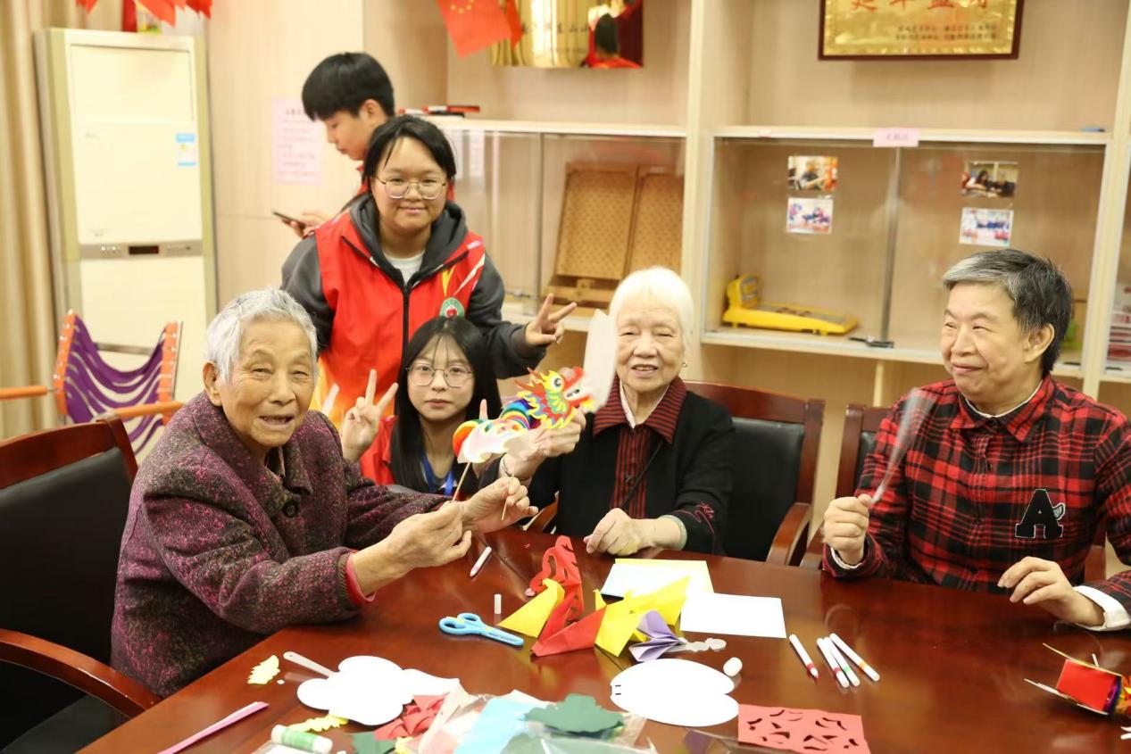 活动现场暖意融融,志愿者们怀着真挚的敬意与爱心,围坐在老人们身旁,开启了一场温馨的折纸互动。从象征美好祝愿的千纸鹤,到造型灵动的创意纸龙,志愿者们耐心细致地进行一对一教学,手把手指导老人折叠步骤。彩纸在指尖翻飞流转,一个个精致可爱的折纸作品逐渐成型;最后以传统剪纸技艺收尾,一纸一剪间,既展现了手工魅力,更串联起志愿者与老人之间的深厚温情。折纸间隙,志愿者们主动与老人唠起家常,认真倾听他们讲述过往岁月的故事,关切询问日常饮食起居与身体状况,用真诚的陪伴驱散老人的孤寂。几个小时的相处中,活动室里笑声不断、暖意涌动,老人们手中捧着亲手完成的作品,脸上洋溢着幸福满足的笑容。