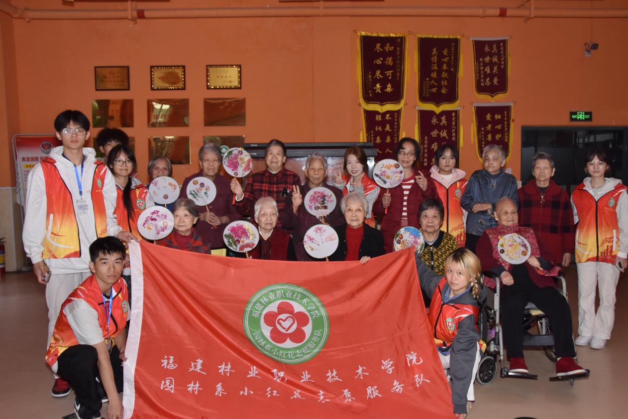 为弘扬敬老爱老的中华传统美德,丰富老年群体的精神文化生活,2025年11月4日,园林系小红花志愿服务队组织学生志愿者走进圣爱老人护养院,开展以手工制扇教学与陪伴交流为核心的志愿服务活动,用青春温情为敬老院的老人们送去关怀与暖意。