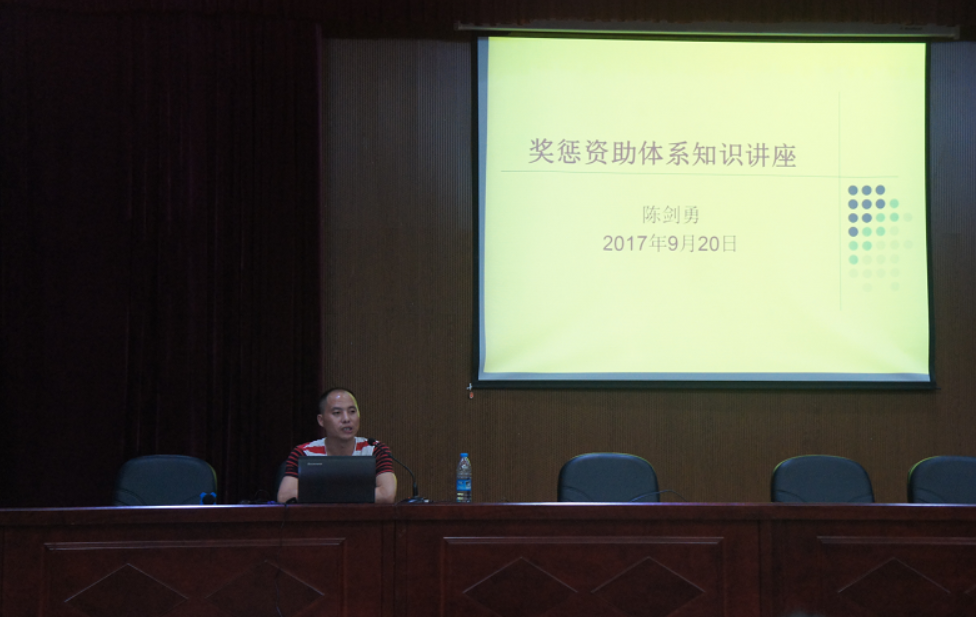 陈剑勇老师对我校的校规校纪作了大致介绍并解释了学校加强校规校纪安全教育的重要原因。让大家明白校规校纪制定的目的不在惩罚,而是为了维护大学良好的氛围,让大家更好地在大学生活,而且遵守校规校纪也是自身良好素质与品格的外在表现。接着陈老师对评先评奖体系与资助体系进行了讲解。我校在奖助学金评选评优工作中以“引导学生全面发展”为目标,本着公开、公平、公正的原则,对德、智、体、美等方面全面发展或者在学业成绩,社会工作实践等方面表现突出的优秀学生以及先进集体,给予表彰和奖励。评奖评优,不仅是对学生优异成绩的肯定,也是树立榜样,弘扬典型,引导学生科学发展,追求卓越的育人过程,在学生中营造了比、追、超的良好成长氛围。