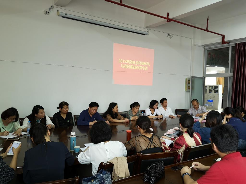 2019年4月23日下午15时,园林系于系会议室召开2019年师德师风与党风廉政教育专题会议。园林系全体专兼职教师参加此次会议。会议由园林系主任黄华明主持。