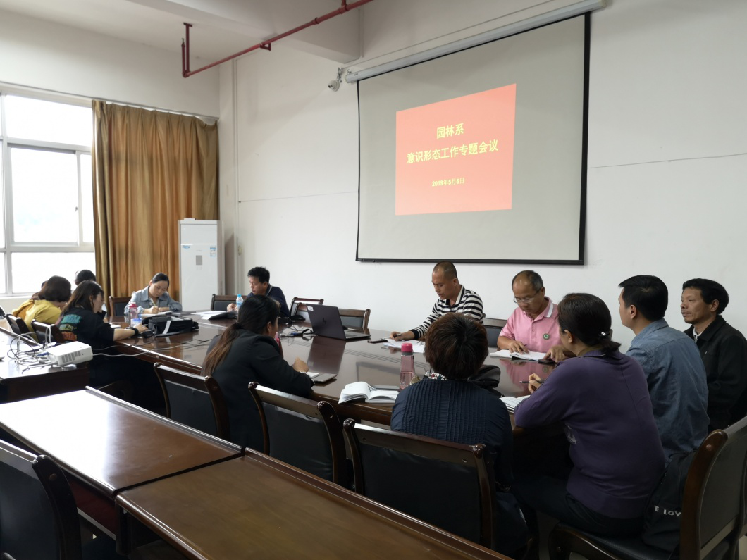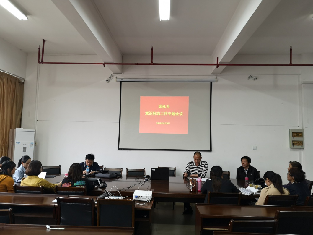 2019年5月5日下午16点,园林系于系会议室召开意识形态工作专题会议。园林系全体专兼职教师参加会议。会议由园林系党总支副书记陈剑勇主持。会上,陈剑勇副书记向大家解读了《园林系党总支落实意识形态工作责任制实施方案》文件:一、完善责任体系,强化组织领导。系党总支对系部师生的意识形态负主体责任,总支书记是第一责任人。按照“党政同责”的原则,系主任对系部师生的意识形态工作负重要责任。成立系部意识形态工作领导小组,党总支书记亲自任组长,系主任任副组长,系部其他班子成员、教研室主任为组员。二、建立工作机制,持续深入推进。1、建立舆情分析研判机制;2、建立工作报告制度;3、建立舆情风险评估制度。三、细化责任清单,牢牢掌控工作阵地。1、加强网络意识形态阵地建设与管理;2、加强课堂教育教学管理责任;3、加强教师思想政治教育和师德师风建设;4、加强系部社团管理责任;5、加强抵御和防范宗教渗透的责任。四、加强督促检查,强化责任意识。建立健全党总支统一领导、党政齐抓共管、各相关责任人分工负责的意识形态工作机制。