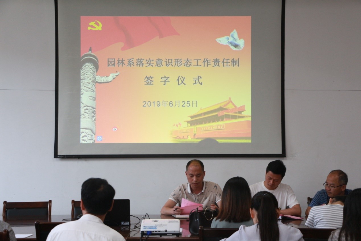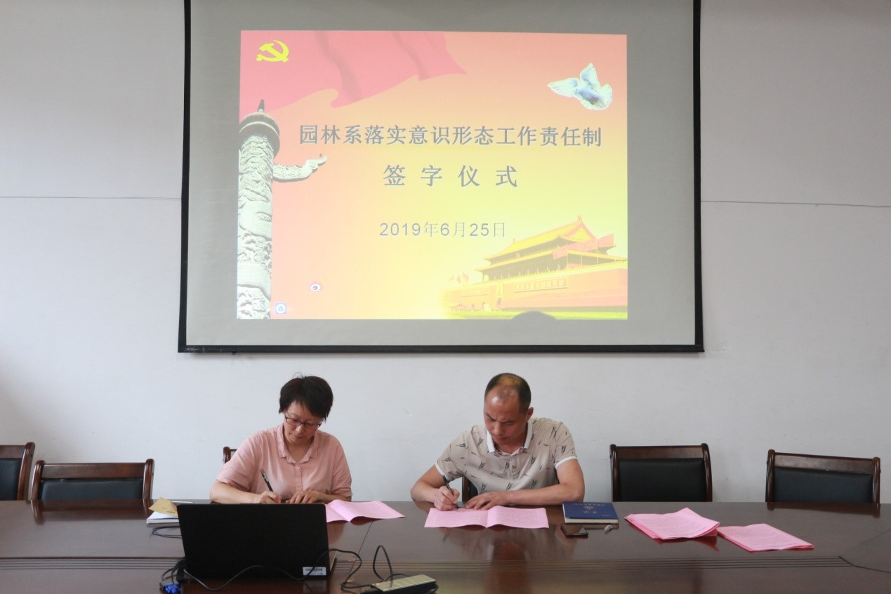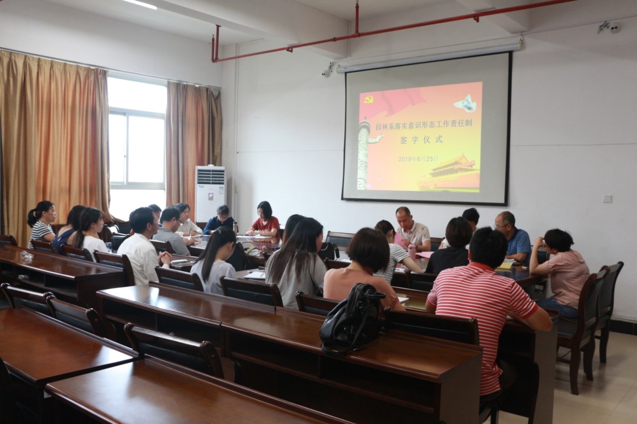 2019年6月25日下午,园林系于系会议室举行落实意识形态工作责任制签字仪式。签字仪式由园林系党总支副书记陈剑勇主持。园林系全体专兼职教师参加了签字仪式。