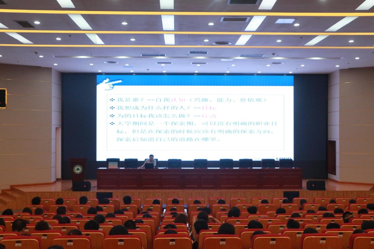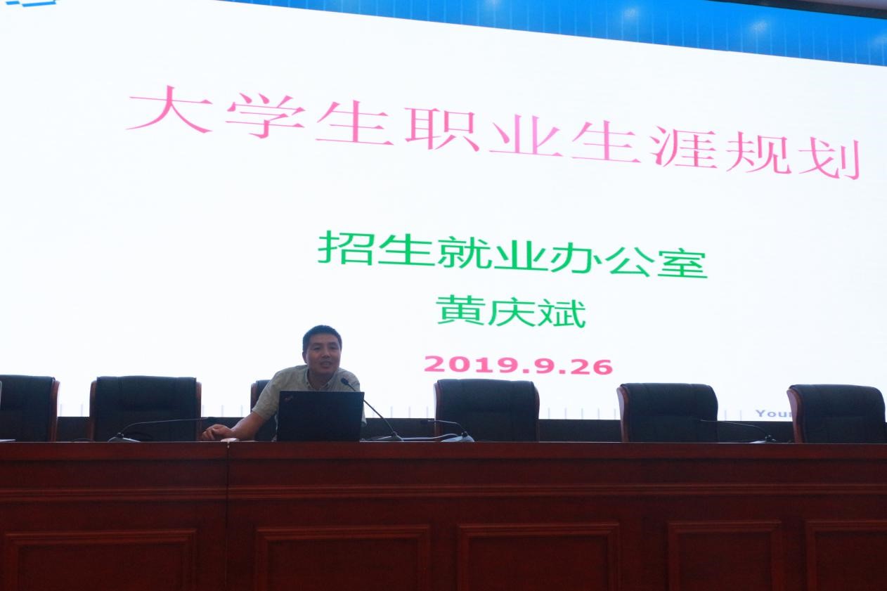 黄庆斌老师主要围绕职业生涯的概念、意义以及职业定位、生涯的决策、职业测评等方面展开讲解。期间,黄老师不时与同学们进行互动,语言诙谐幽默,与同学们分享自己颇有心得的心理测试,引起了现场的热烈讨论与反响。在心理测试的同时,黄老师根据我系目前现状分析了几方面不良现象,分别从德育、自我管理等方面提出须进行深刻反思,紧接着用多个案例以及数据阐述了职业生涯规划的重要性,并从“什么是职业生涯规划”、“什么时候开始职业生涯规划”、“职业生涯规划与人生成功的关系”、“如何规划职业生涯”等几个方面展开论述。