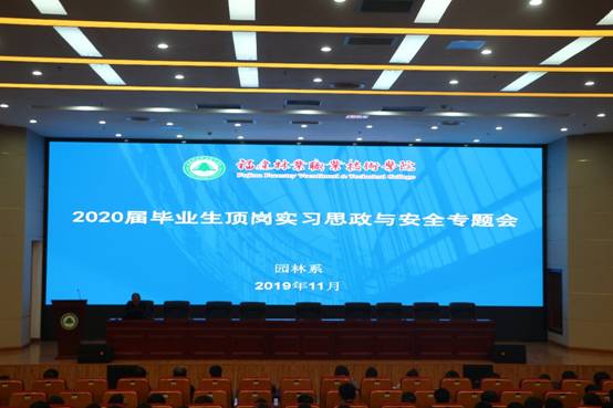 2019年11月28日下午16:45,园林系于图书馆学术报告厅召开2020届毕业生顶岗实习思政与安全专题会。参加本次会议的有:园林系主任黄华明副教授、园林系党总支副书记陈剑勇老师、园林系教学管理科科长陈剑峰老师、园林系全体专兼职教师与2020届全体毕业生。会议由园林系党总支副书记陈剑勇老师主持。