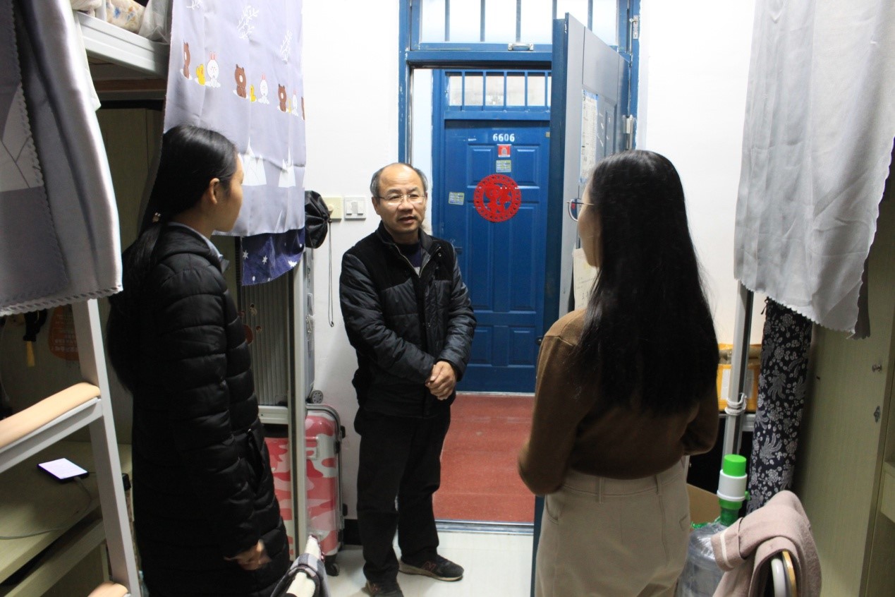 在学生宿舍,值此辞旧迎新之际,系领导向同学们表达了自己的喜悦与祝福。黄华明主任与吴旻科长与同学们亲切交流,了解他们的生活情况、期末考试复习情况和假期的安排。师生们还共同回忆起刚过去的一年里许多日常生活的趣事,欢快的笑声在宿舍回荡。