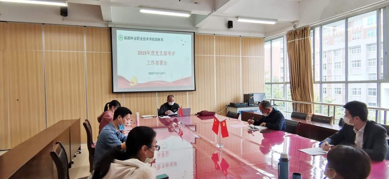 2020年3月24日上午,园林系党总支于系会议室召开2019年度党支部考评工作部署会。系领导陈剑勇、黄华明、陈剑峰、吴旻、张称称、系学生党支部书记吴锦鸿、辅导员孙钰参加了会议。会议由系党总支书记陈剑勇主持。