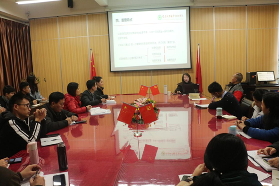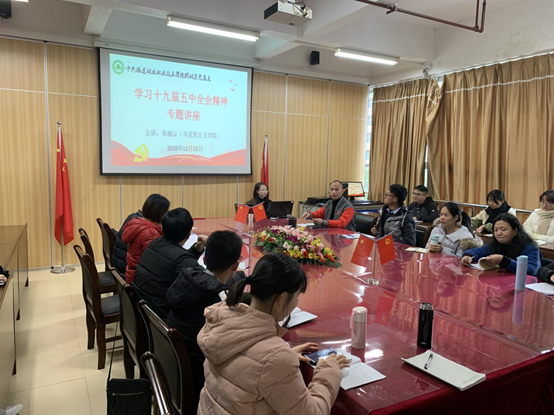 2020年12月15日14:40,园林系党总支在系会议室召开学习十九届五中全会精神专题讲座。系党总支书记陈剑勇、系主任黄华明、系部专兼职教师以及学生党员参加本次讲座。本次讲座由园林系党总支书记陈剑勇主持,马克思主义学院朱丽云老师进行授课。