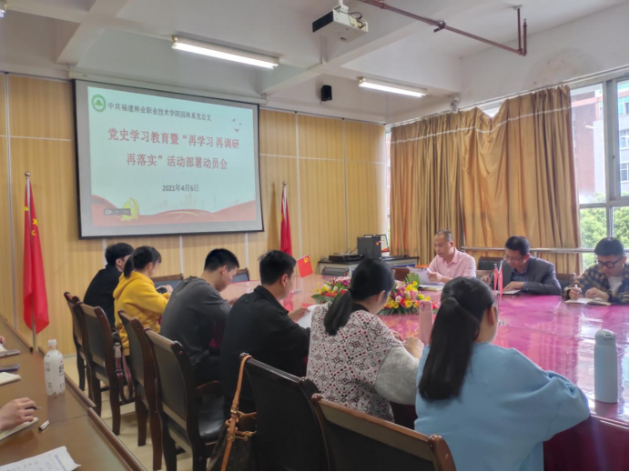 2021年4月6日下午,园林系党总支于系会议室召开党史学习教育暨“再学习、再调研、再落实”活动部署动员会,副院长叶世森和园林系全体教师党员参加会议,园林系党总支书记陈剑勇主持会议。