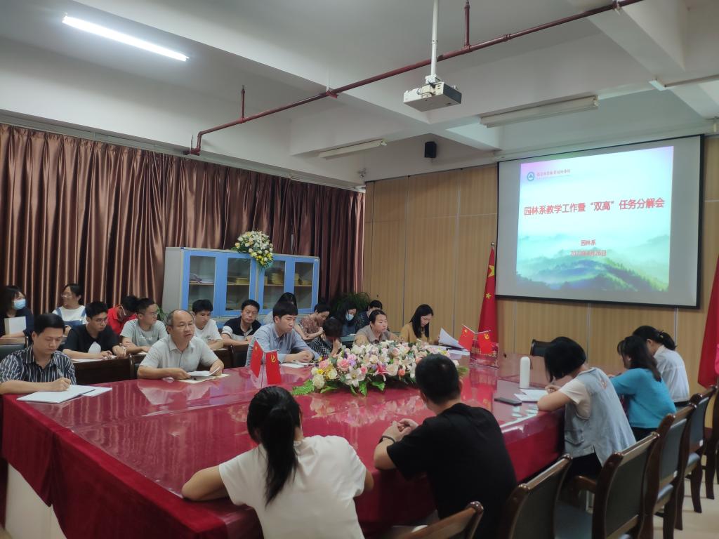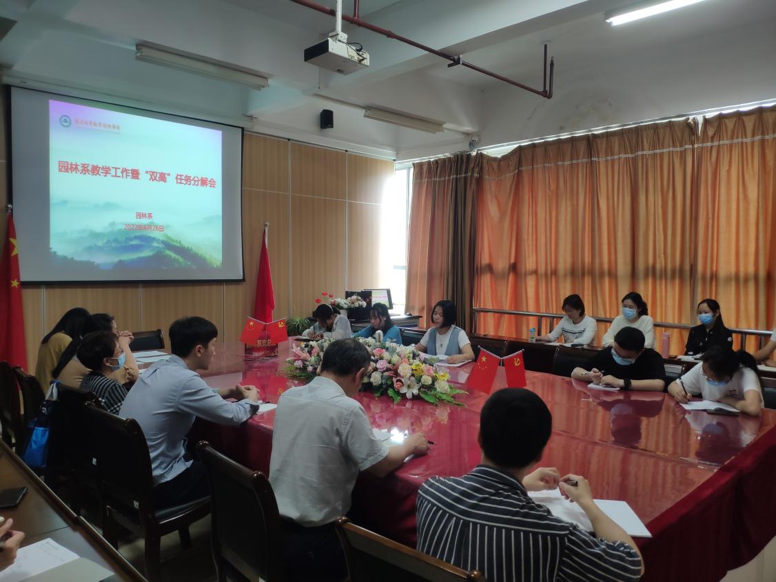 2022年4月26日下午,园林系在实训一3楼会议室召开本学期第四次教学工作暨“双高”建设任务分解会。与会人员有:学院副院长罗立仪、园林系党总支书记陈剑勇、系主任黄华明、系党总支副书记黄淑燕、系副主任陈剑峰以及系全体专兼职教师参加会议。会议由园林系主任黄华明主持。