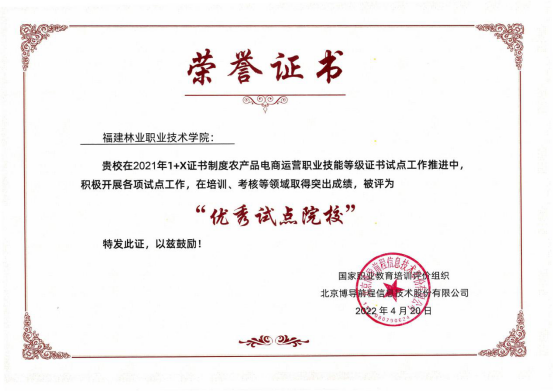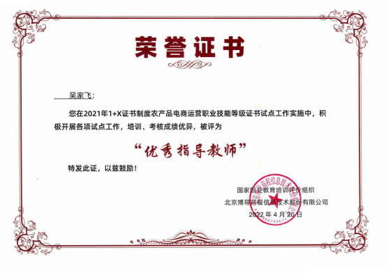 近期,在4月20日线上召开的“2021年度1+X证书试点工作表彰会暨2022年岗课赛证融通育人模式研讨会”上,我院荣获教育部1+X证书试点工作“优秀试点院校”,我系陈剑峰荣获“优秀考务管理员”称号,黄梓良、吴家飞荣获“优秀指导教师”称号。