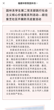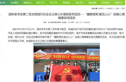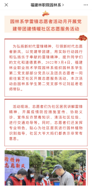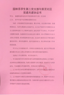 高校学生党建与社区基层党组织实现共建,建立共建的长效机制,实现资源共享,让学生党员走出校门、走进社区、服务社会。园林系学生第二党支部与延平区四鹤街道紫芝、延福社区开展党建共建合作,将培育和践行大学生社会主义核心价值观作为支部党建工作的一项主题,通过整合学校、社区教育资源,为学生搭建社会实践平台,以习近平新时代中国特色社会主义思想为指导,发挥党员传帮带的纽带作用,将大学生社会主义核心价值观教育与支部党建工作活动进行有机结合,提升党支部战斗堡垒作用,推动支部党建工作创新发展。