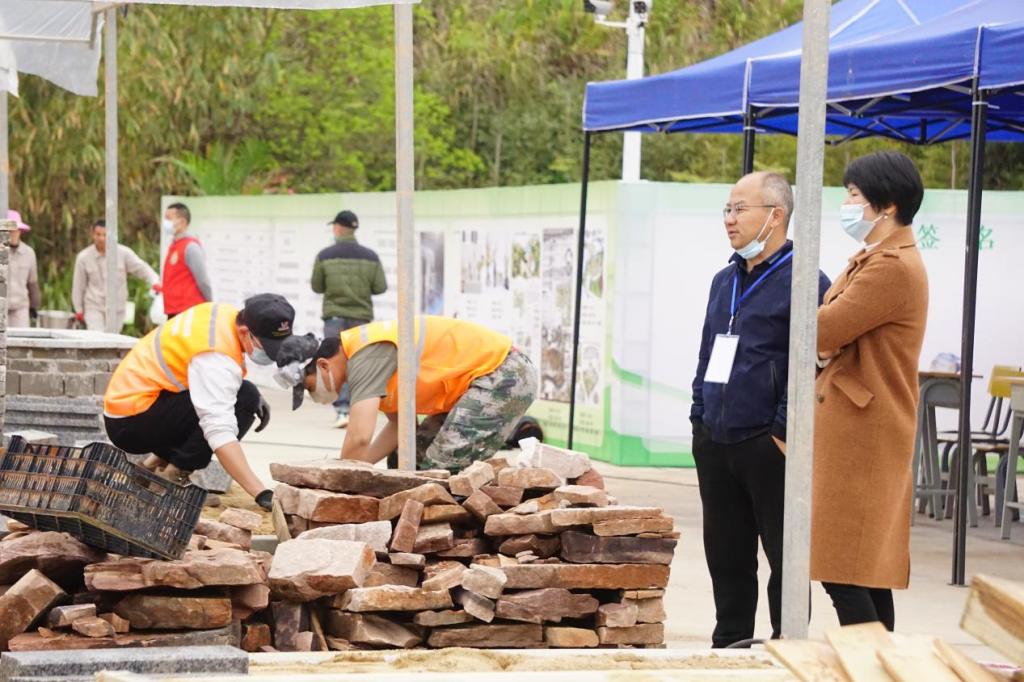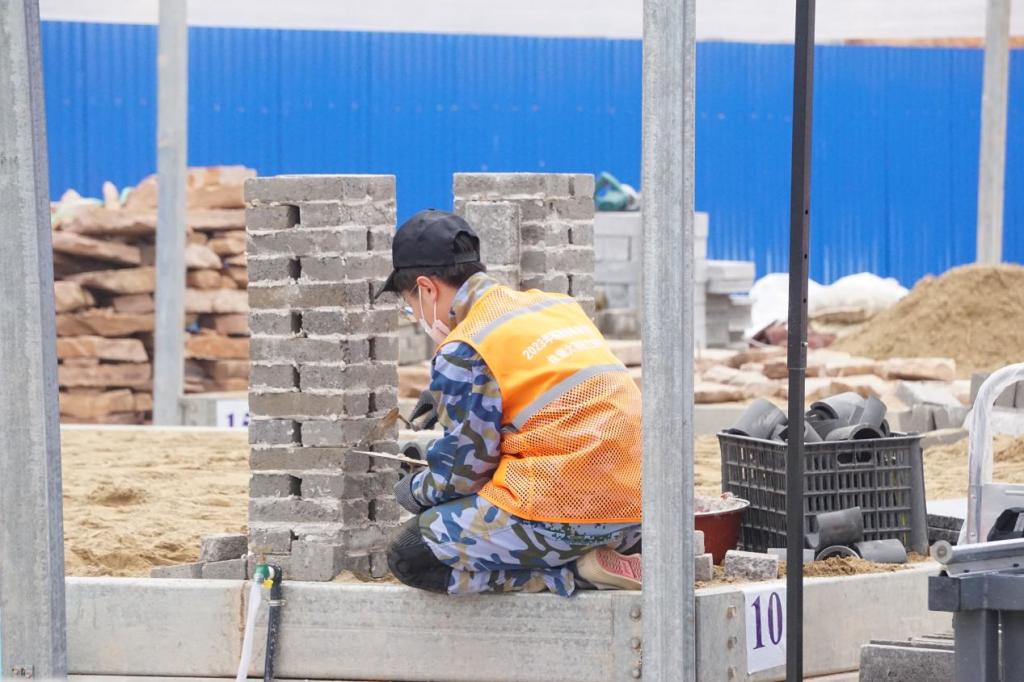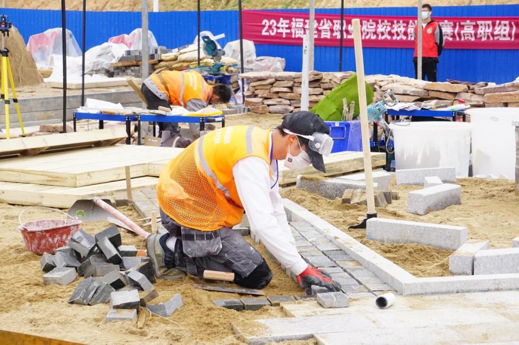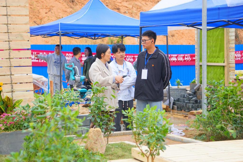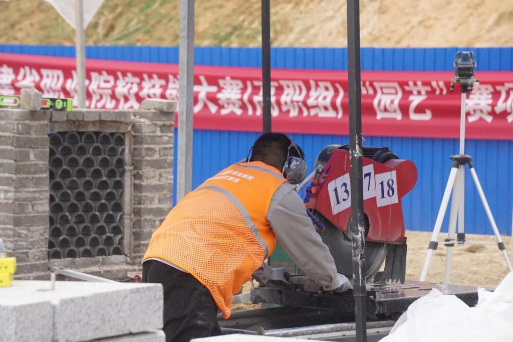 来自全省15所高校15支代表队的30位参赛选手同台竞技。园艺赛项考核内容涵盖园林施工图设计、测量、园林工程施工等方面的知识和技能。每个参赛组由2位选手组成,选手首先根据指定的环境、材料完成一套7m×7m的小花园景观设计施工图,然后根据本团队的设计经过施工,在指定工位上完成木作、砌筑、铺装、水景营造、植物造景等模块,各模块有机结合在一起组成一件园艺作品。比赛现场,参赛选手根据赛项规程规范制图,加入创新设计理念;身着统一工作服,手带劳保手套,熟练地运用各种工具和材料进行施工搭建,合理分工、配合默契、凝神专注。