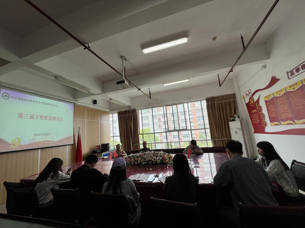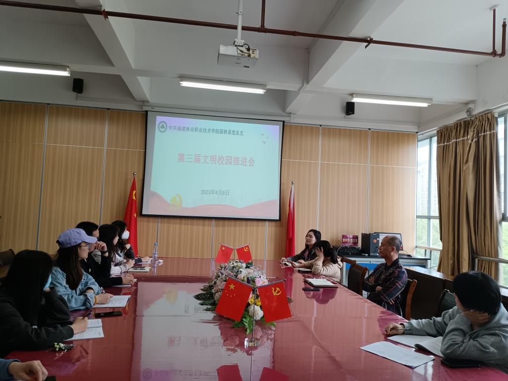 2023年4月6日,园林系党总支召开第三届文明校园建设推进会,部署推进系部文明校园工作。系党总支书记陈剑勇、副书记黄淑燕、学生科科长吴锦鸿、专职组织员吴慧敏及各党支部书记及相关工作人员参加会议。会议由陈剑勇书记主持。