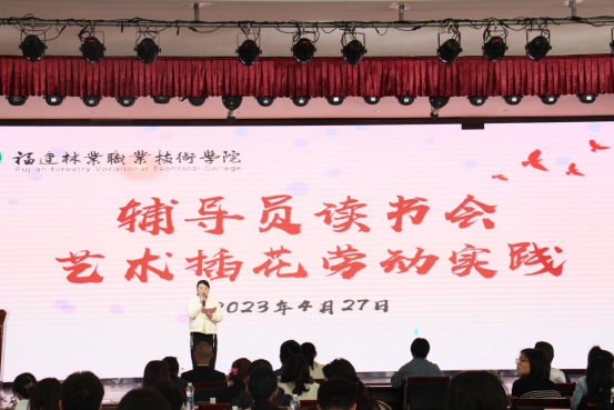 为了深入学习贯彻习近平新时代中国特色社会主义思想主题教育,在辅导员中大力弘扬劳模精神、劳动精神、工匠精神,鼓励辅导员将劳动教育纳入人才培养全过程。4月27日上午,以“艺术插花劳动实践”为主题的辅导员读书会在江南校区礼堂举行,院学工部部长蔡敏、园林系党总支书记陈剑勇、园林系党总支副书记黄淑燕、各系学生科科长兼团总支书记和全体专职辅导员参加了本次活动,活动由园林系学生科科长兼团总支书记吴锦鸿主持。