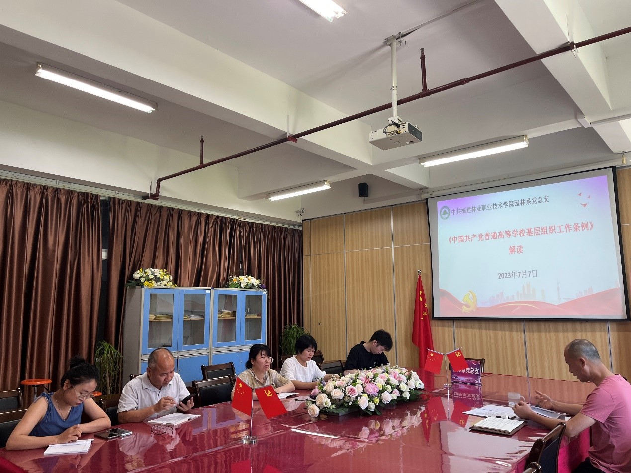 为深入学习贯彻党的二十大精神,响应省委深学争优、敢为争先、实干争效”行动,进一步贯彻落实中共福建省委组织部关于印发《福建省贯彻落实<2019-2023年全国党员教育培训工作规划>的具体措施》的通知(闽委组通〔2020〕32号)精神以及中共福建林业职业技术学院委员会关于举办福建林业职业技术学院2023年党务干部培训班的通知(组织部〔2023〕6号)持续推进基层党组织标准化规范化建设,园林系党总支持续开展2023年党务干部培训班学习会,7月5日组织开展《中国共产党普通高等学校基层组织工作条例》(以下简称《条例》)解读,培训班成员共同参与。