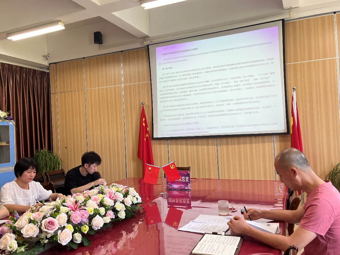 接着大家共同学习《条例》具体内容,并分享学习心得。党总支副书记黄淑燕说道:中共中央印发了新修订的《中国共产党普通高等学校基层组织工作条例》(以下简称《条例》),对于构建新时代高质量的高校党建工作体系,提高高校基层党组织建设工作质量,全面贯彻党的教育方针,落实立德树人根本任务,引领高等教育的高质量发展具有重要意义。