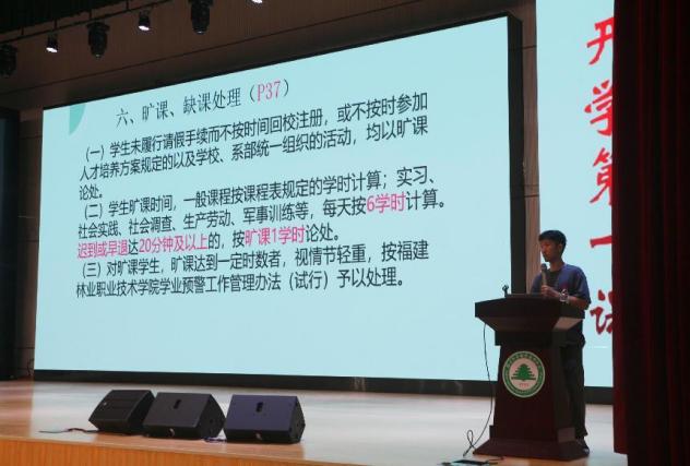 首先由刘延君老师对学院章程进行说明,引导学生培育和践行社会主义核心价值观,让同学们养成珍爱生命、尊重人权、尊敬师长、诚实守信、爱护自然、热心公益的良好品性。接着他从学籍与学业管理方面进行讲解,通过对学籍管理规定的详细解读让新生们对学籍管理相关制度有了深入认识。随后他又介绍了校纪校规、学生行为准则,让新生更加明确学校的各项规章制度,明确什么可以做什么不可以做,在规则范围内更好安排好自己的学习和生活,提醒自己注意言行举止。