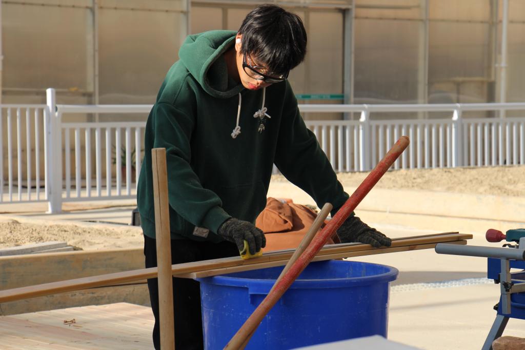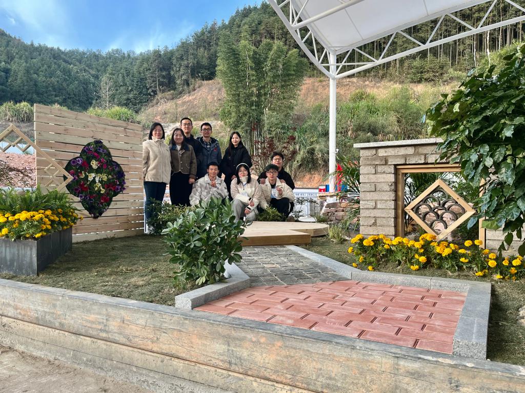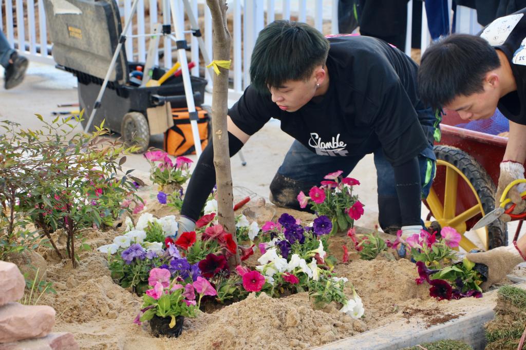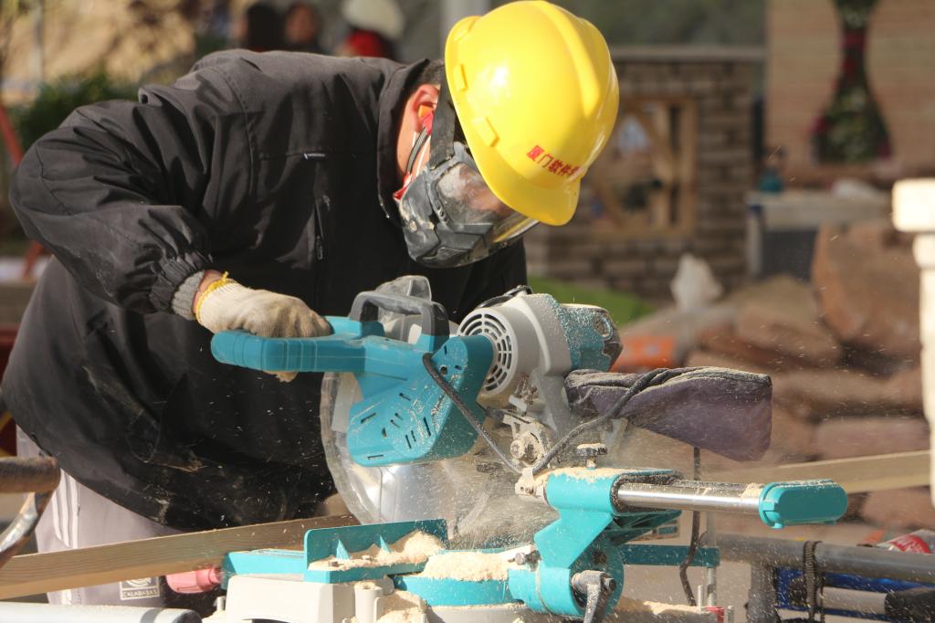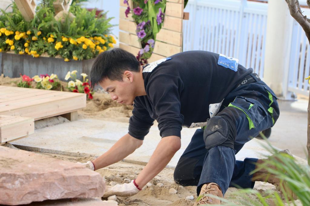 12月24日,参赛选手到达后山施工赛场,抽取施工位号,由两名参赛成员组成的小组根据设计施工图进行施工,在抽取到的指定工位上进行木作、景墙筑造、地面铺装、水景营造、绿化造景等工程,将各个工程模块进行组合,完成小花园景观施工。