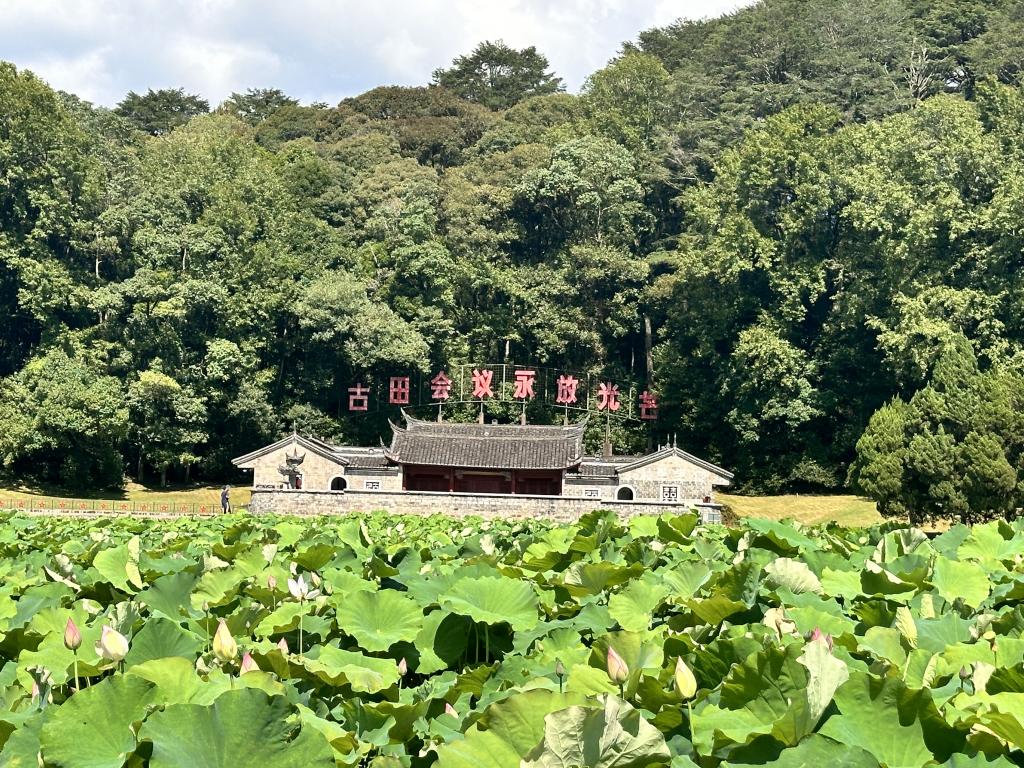 队伍继续向前探索,穿越荷香四溢的荷花池,在茂密树林的掩映下,“古田会议 永放光芒”八个红色大字熠熠生辉,仿佛诉说着那段光辉的历史。周围巍峨挺立的龙柏,苍翠欲滴的枝叶伸向碧空,如同古田会议精神的永恒丰碑,彰显着不屈不挠与坚定信念的力量。
