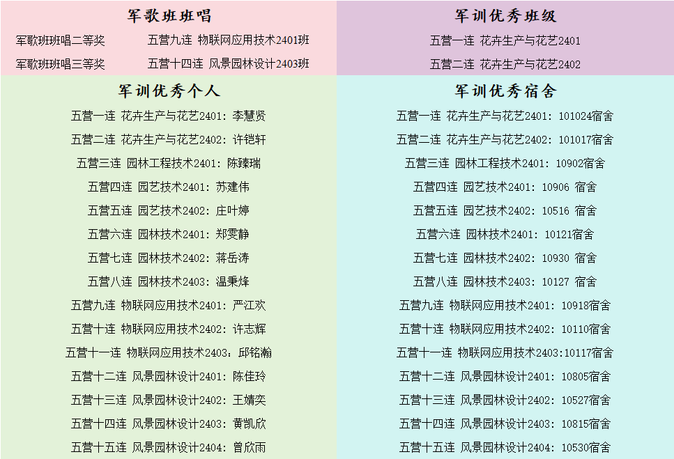 在此,我们要衷心祝贺在军歌班班唱、军训优秀班级、军训优秀个人以及军训优秀宿舍评选中获奖的班级和同学。这十四天的军训,是新生们成长道路上的一座重要里程碑。他们在训练中锻炼了强健的体魄,为未来的学习和生活奠定了坚实基础;培养了严明的纪律意识,懂得了遵守规则和秩序的重要性;更在团队训练中收获了深厚的团队精神,明白了集体力量的无穷。