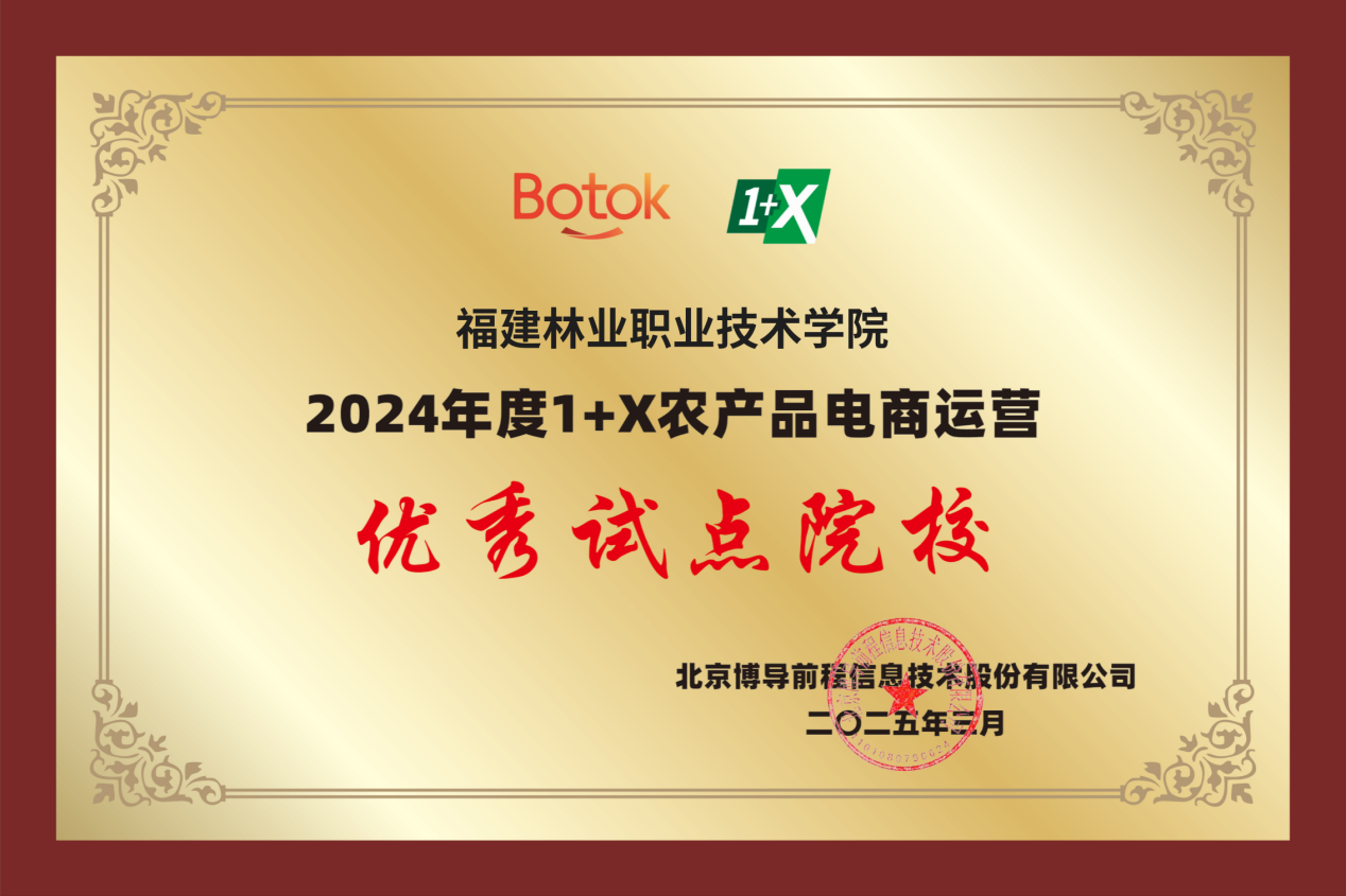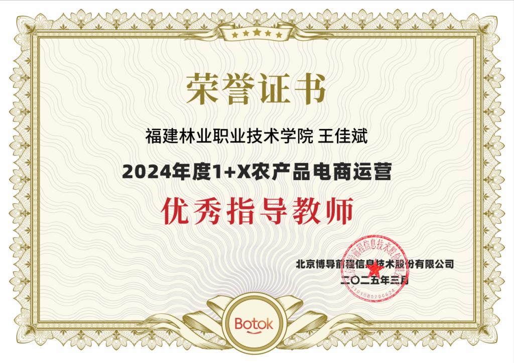 在2024年度,福建林业职业技术学院园林系“1+X农产品电商运营”等级证书相关工作在院系领导与老师们的大力支持下,各项任务均顺利推进并取得了优异成绩。为表彰先进、树立典范,学院被授予“2024年度1+X农产品电商运营优秀试点院校”荣誉称号;同时,靳莎老师与王佳斌老师因在指导工作中的突出表现,被评为“优秀指导教师”。