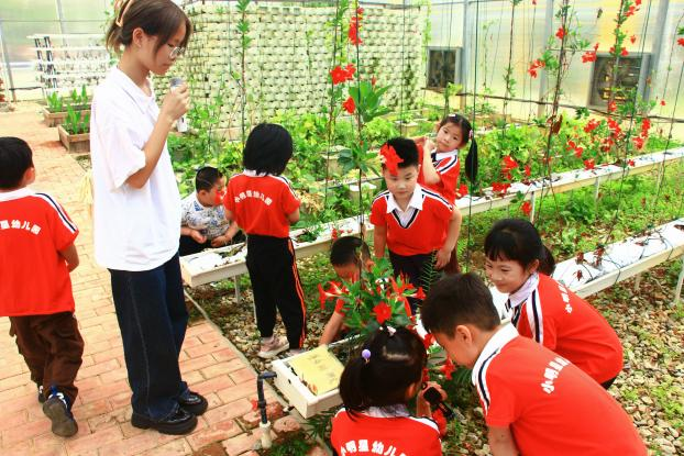 活动当天,小朋友们排着整齐的队伍,怀揣着满心的期待与好奇,迈着欢快的步伐踏入生态景观科普基地。戴曲顺老师热情迎接,带领小朋友们开启参观之旅。在新中式园林区域,老师详细介绍了新中式园林的独特韵味与设计特点;行至温室栽培区,老师生动讲解植物的栽培过程,让孩子们了解生命成长的奇妙;错落有致的景观小品前,孩子们驻足观赏,眼中满是新奇。漫步基地,形态各异的奇特植物牢牢吸引住小朋友们的目光。戴曲顺老师耐心细致地讲解每一种植物的名称、特点及用途,用生动形象的语言将孩子们引入大棚中神秘的科普世界,现场不时传来孩子们充满童真的惊叹与提问声。