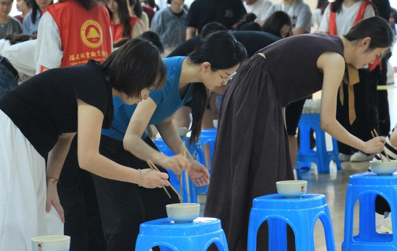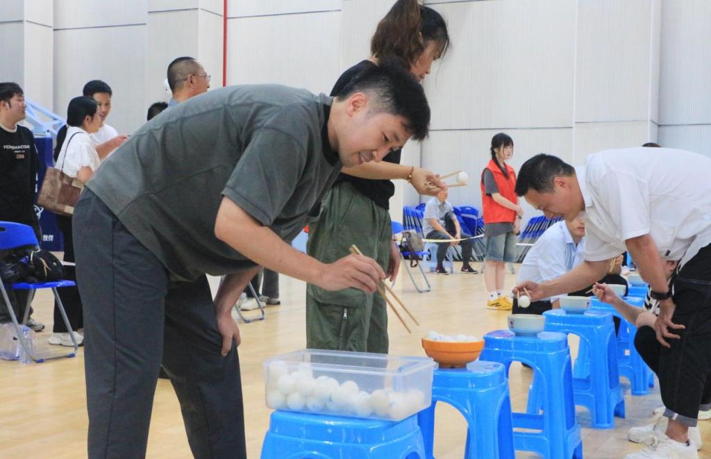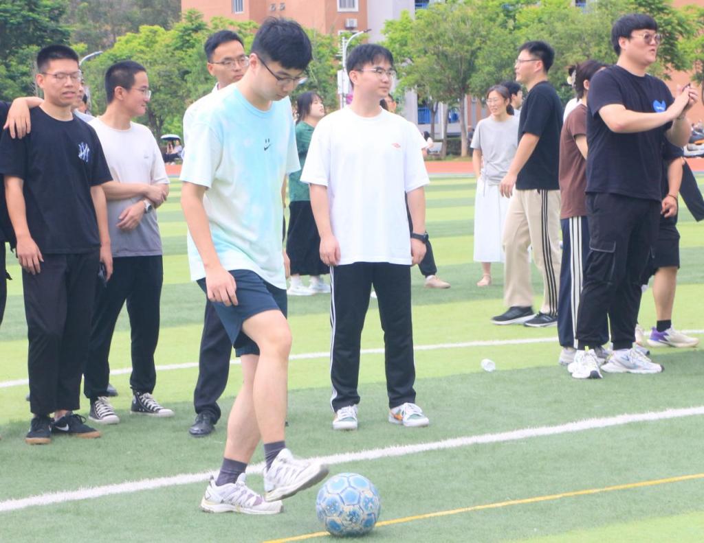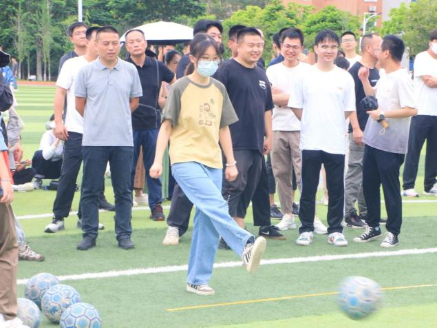下午2时40分,各参赛队员准时于江南校区体育馆集合,简短的赛前动员后,夹乒乓球接力赛率先在体育馆一楼打响。比赛现场,队员们手持筷子,神情专注,小心翼翼地将乒乓球依次传递,力求精准地将球放入队友碗中,大家全神贯注比拼传递个数,现场气氛紧张而热烈,不时传出阵阵欢笑与加油声。随着接力赛的结束,参赛队员们迅速移步足球场,开启足球点球大战环节。每位参赛队员拥有5次射门机会,只要将球踢入指定区域内便算有效得分。赛场上,平日里温文尔雅的老师们化身绿茵场上的运动健将,摩拳擦掌、各展球技,时而大力抽射,展现出强劲的爆发力;时而巧妙推射,彰显出细腻的脚法,精彩瞬间不断上演,欢呼声此起彼伏。