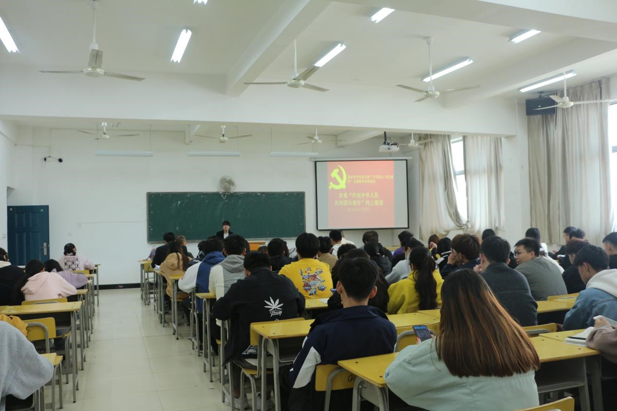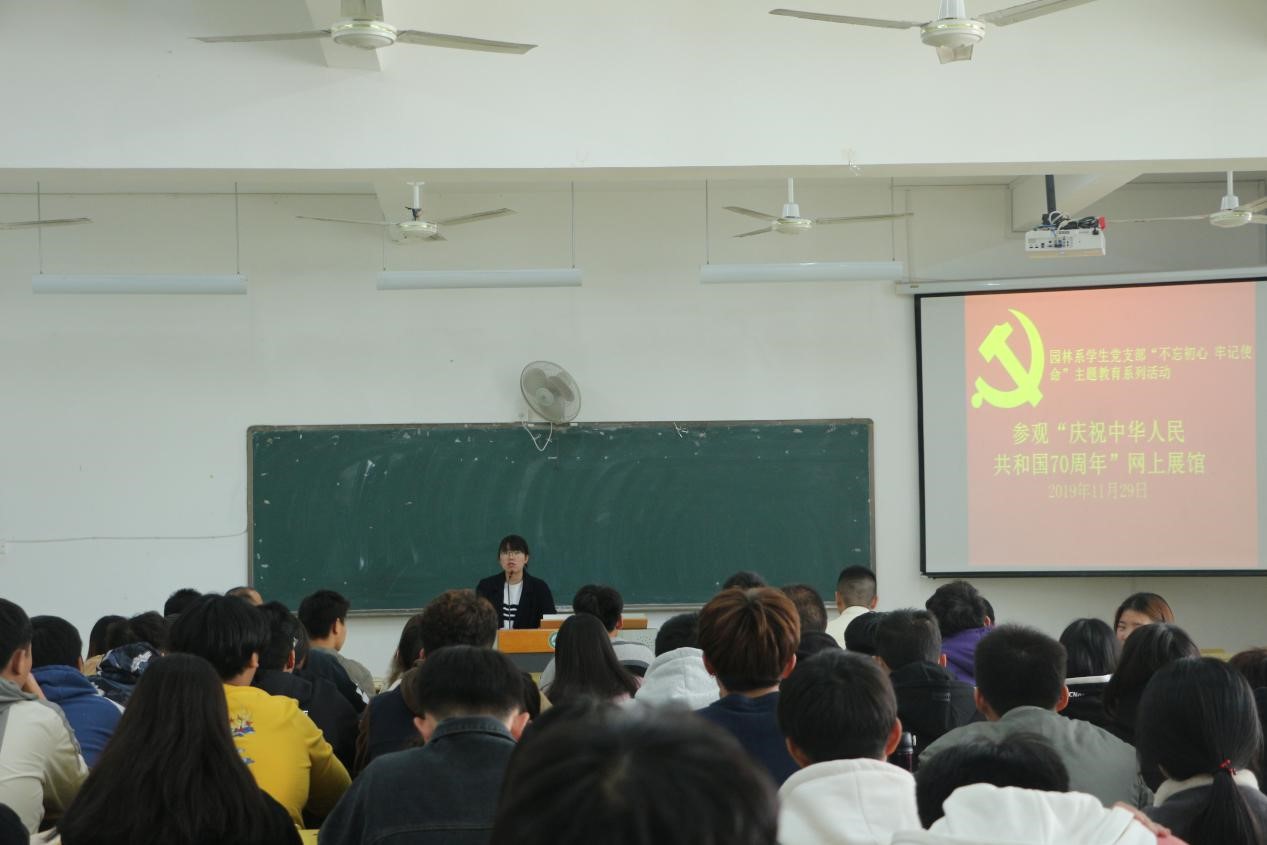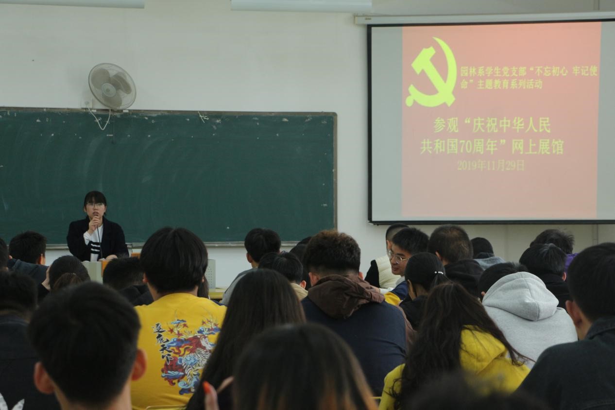 2019年11月29日中午12:20,园林系学生党支部在实训四510开展“不忘初心、牢记使命”主题教育系列活动——参观“庆祝中华人民共和国成立70周年”网上展馆。活动由党支部书记吴锦鸿主持。支部全体党员和积极分子参加活动。