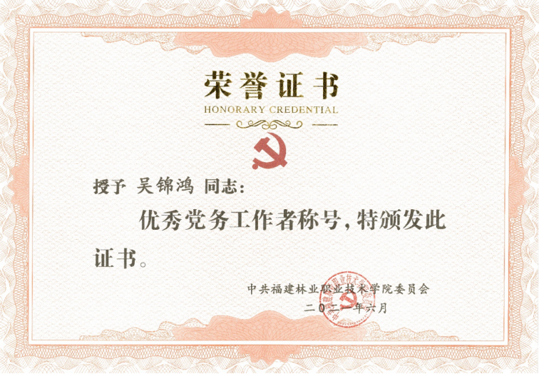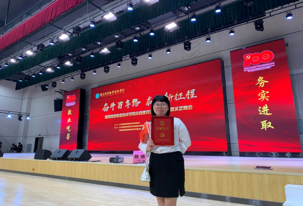 她是一名优秀的党务工作者,具有较好的政治觉悟,思想端正,态度诚恳。工作期间坚持通过在学生党支部集中学习与自身学习相结合,不断提高政治理论水平,用马克思主义思想来武装自己,加强理论修养,争取在工作岗位实现人生价值。她每年都会通过培训等多种形式的继续教育,丰富自身的理论学习。担任学生支部书记期间坚持发展与培养并重,建立完善党员考核体系和监督机制,将思想教育与理论学习作为工作的核心,完成样本支部的建设,深化推进“两学一做”学习教育常态化制度化,“三会一课”制度规范落实,同时不断探索“党员“1+X”责任寝室联系制度建立与实践支部立项项目实践研究,坚持并树立学生党员的服务意识,2021年她获得学院优秀党务工作者称号,所带支部的立项活动“党员“1+x”责任寝室联系制度建立与实践”获得福建省高校党支部工作“立项活动”优秀成果三等奖。
