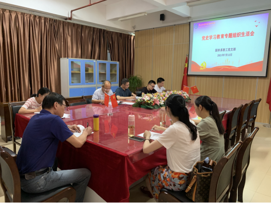 2021年7月12日下午,园林系教工党支部召开了党史学习教育专题组织生活会。参加生活会的教工党员有:张毅、黄华明、叶世森、黄淑燕、危静美、张称称、邱雯、黄智杰、郑建忠等9人。会议由黄华明同志主持。