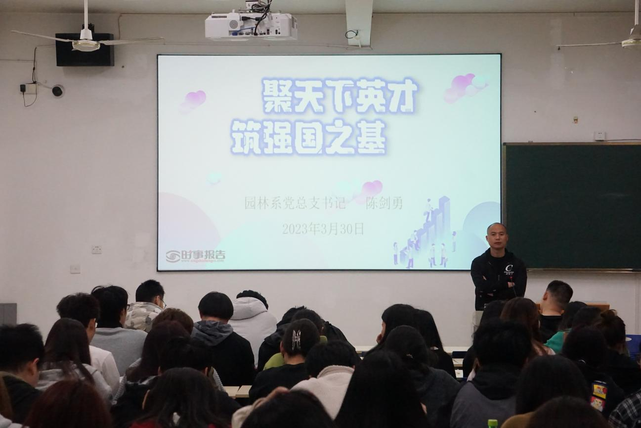 在新时代背景下,国际环境复杂多变,世界正经历百年未有之大变局,对人才自主培养和科技自立自强提出了更高要求,也对全面提高人才自主培养质量赋予了新的时代使命。为贯彻落实党的二十大精神,发挥党建领航作用,3月30日晚七点半,园林系党总支书记陈剑勇以“聚天下英才,筑强国之基”为题在教学楼208召开专题讲座,风景园林设计2101、2102全体在校学生共同参与。