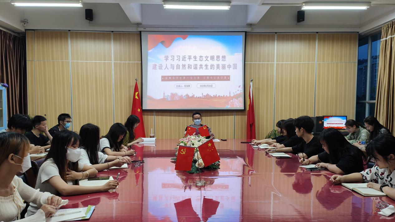 为深入学习贯彻习近平新时代中国特色社会主义思想,落实省委“深学争优、敢为争先、实干争效”行动部署以及深入推进党的二十大精神学习走深走实,强化学习型党支部建设。2023年5月25日,园林系学生第一党支部开展“学习习近平生态文明思想,建设人与自然和谐共生的美丽中国”专题党课,党课由党支部书记倪海奔同志主讲,支部师生党员积极参与。