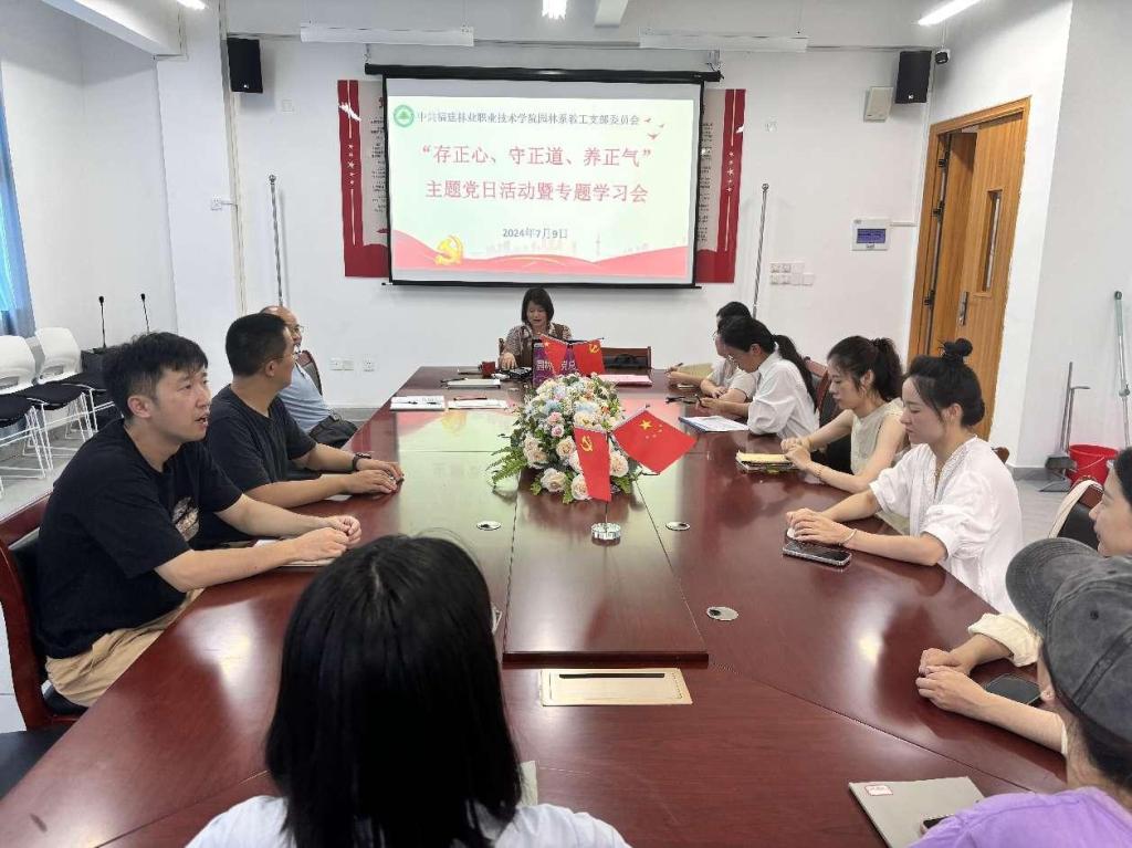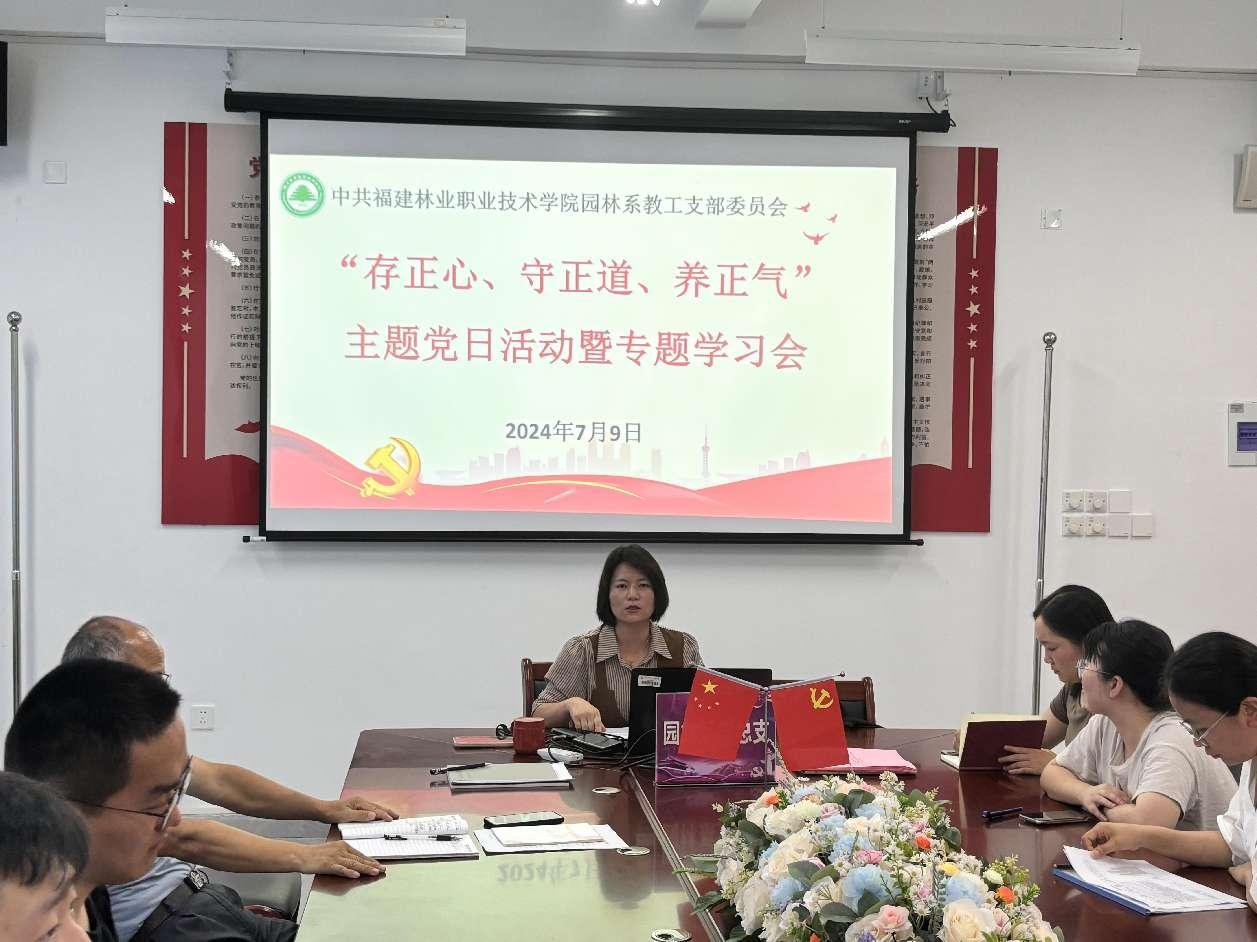2024年7月9日,园林系教工党支部在园林楼408会议室成功举办了以“存正心、守正道、养正气”为主题的党日活动暨理论学习专题会。此次活动旨在深入学习宣传贯彻党的二十大精神,推动学习贯彻习近平新时代中国特色社会主义思想主题教育走深走实,将弘扬教育系统新风正气福建“名片”精神融入具体工作,进一步增强园林系教工支部党员的立德树人、教书育人的荣誉感和责任感。