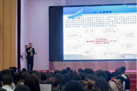 毛老师首先强调了学籍档案对每一个人的重要性,这是就业路上的必须材料,是我们的学历证明,也是各大企业了解你的第一材料;接着强调了流动人员人事档案管理,也是所谓的党员档案的转移关系及一些相关党员的内容。还有对有无职称的专业性人才的相关差别知识进行了普及,告知同学们应尽可能的提升自我水平,这也是今后就业路上是否坎坷的一大重要节点。随后对人事档案的构成、档案管理知识、人才服务中心、书面劳动合同以及就业协议书进行了相关知识的普及。